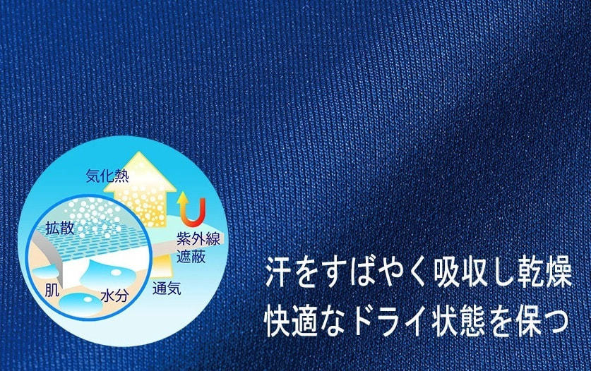 この生地には毛細管現象を応用し、生地の肌側についた汗を外側へ移動させて素早く拡散、乾燥させることで、不快なべとつきを軽減しています。