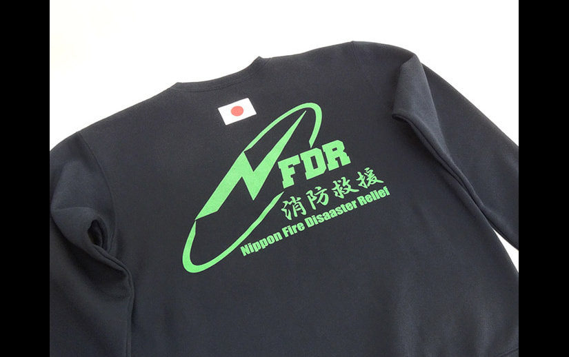 グリーンを基調にした左胸に日本消防救援、背中にはNFDRロゴマークと日の丸のプリント入り。