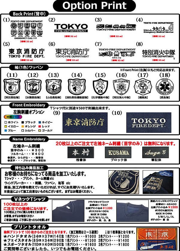 春夏物Tシャツ、ドライ、Vネック、綿混、ポロシャツのほか、ノースリーブや手ぬぐい、タオル、トートバックなどもご用意しました。